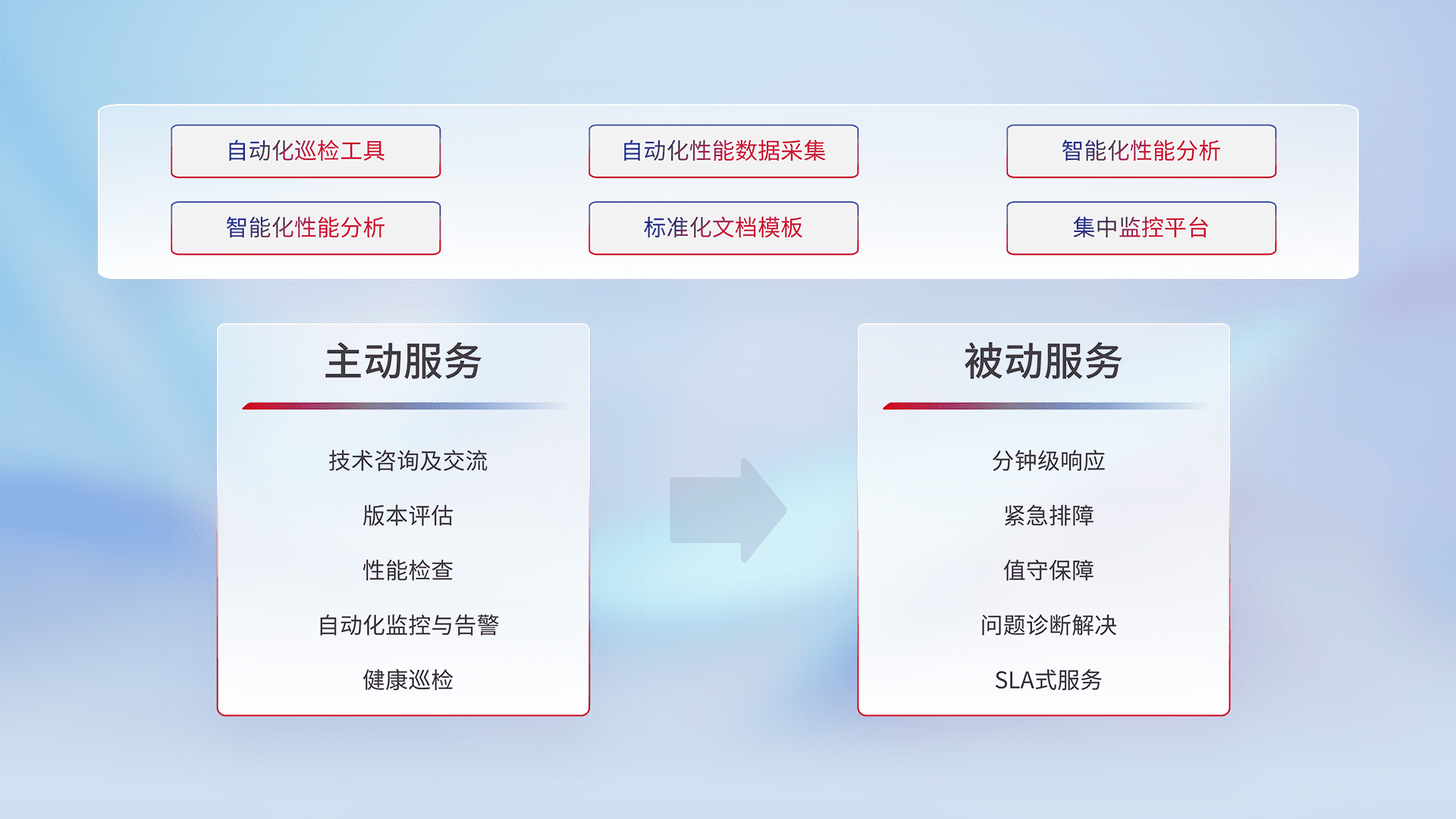 智能化工具和标准化文档,,,保障服务质量,,,提供主动服务(包含技术咨询、、、、版本评估、、、、性能检查、、、自动化监控与告警、、健康巡检)和被动服务包含(分钟级响应、、紧急排障、、、值守保障、、、问题诊断解决、、、SLA服务)。。。